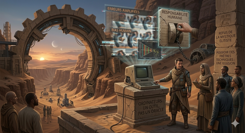 Pour Herbert, un ordinateur est un “outil-cerveau” qui dépend entièrement de l’utilisateur humain. Il n’a aucune “magie” propre ; son seul pouvoir est d’exécuter des tâches “très rapidement”. En titrant un chapitre “Computers Are Not Oracles”, Herbert prévenait déjà contre la tendance humaine à projeter une autorité prophétique sur les machines. Il identifiait plusieurs dangers liés à cette perception :